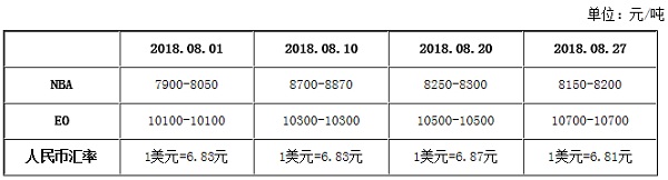 表 1 8月(yue)中國乙二(er)醇丁醚上(shang)遊原材料(liào)漲跌一覽(lǎn)表