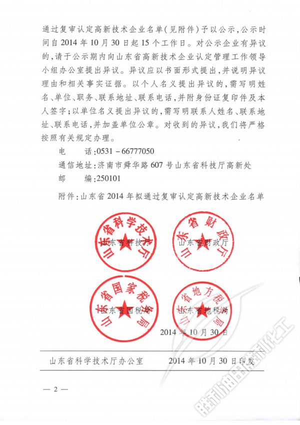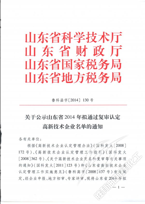 關于公示(shi)山東省2014年拟(nǐ)通過複審認(ren)定高新技術(shu)企業名單的(de)通知