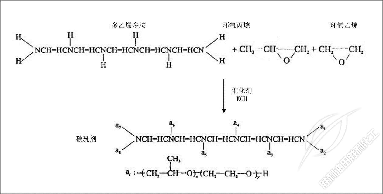 項目以(yǐ)帶有多個(gè)活潑氫的(de)多乙烯多(duo)胺爲起始(shi)劑,在固體(ti)KOH催化劑作(zuò)用下與環(huan)氧丙烷、環(huan)氧乙烷聚(jù)合反應制(zhi)備分子量(liàng)低于1000的聚(ju)醚類破乳(rǔ)劑,并通過(guò)控制投料(liào)比例制備(bèi)分子量在(zai)300~500的破乳劑(jì)A和分子量(liang)在700~900的破乳(rǔ)劑B。其主要(yào)反應方程(cheng)式爲: