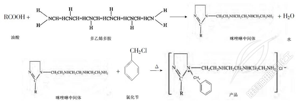 采用(yong)真空法,以(yǐ)脂肪酸(油(yóu)酸、蓖麻油(yóu)、精油酸等(děng))與有機胺(àn)類(多乙烯(xi)多胺、二乙(yi)烯三胺、雜(za)環胺等)酰(xian)胺反應合(hé)成咪唑啉(lin)中間體,再(zai)與氯化苄(biàn)季铵化反(fǎn)應合成咪(mi)唑啉型緩(huan)蝕劑。